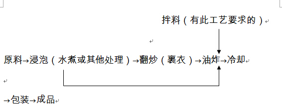 1.清理設(shè)備;2.熟制(滅菌)設(shè)備(蒸煮、烘炒、干燥、油炸等相應(yīng)的設(shè)備);3.裹衣設(shè)備或粉碎設(shè)備或混合設(shè)備(有此類工藝要求的);4.包裝設(shè)備(封口、生產(chǎn)日期標(biāo)注、計量稱重等設(shè)備)。