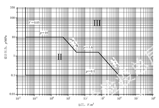 說明:按照工作介質(zhì)選擇介質(zhì)分組,根據(jù)設(shè)計壓力P(單位Mpa)和容積V(單位m3)標出坐標點,位于Ⅰ類區(qū)域就是一類容器,位于Ⅱ類區(qū)域就是二類容器,位于Ⅲ類區(qū)域就是三類容器。